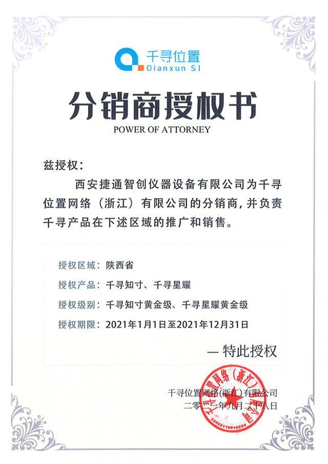 2021年9月28日千寻位置正式授权西安捷通智创仪器设备有限公司为千寻位置网络(浙江)有限公司的分销商,并负责千寻产品在下述区域的推广和销售。