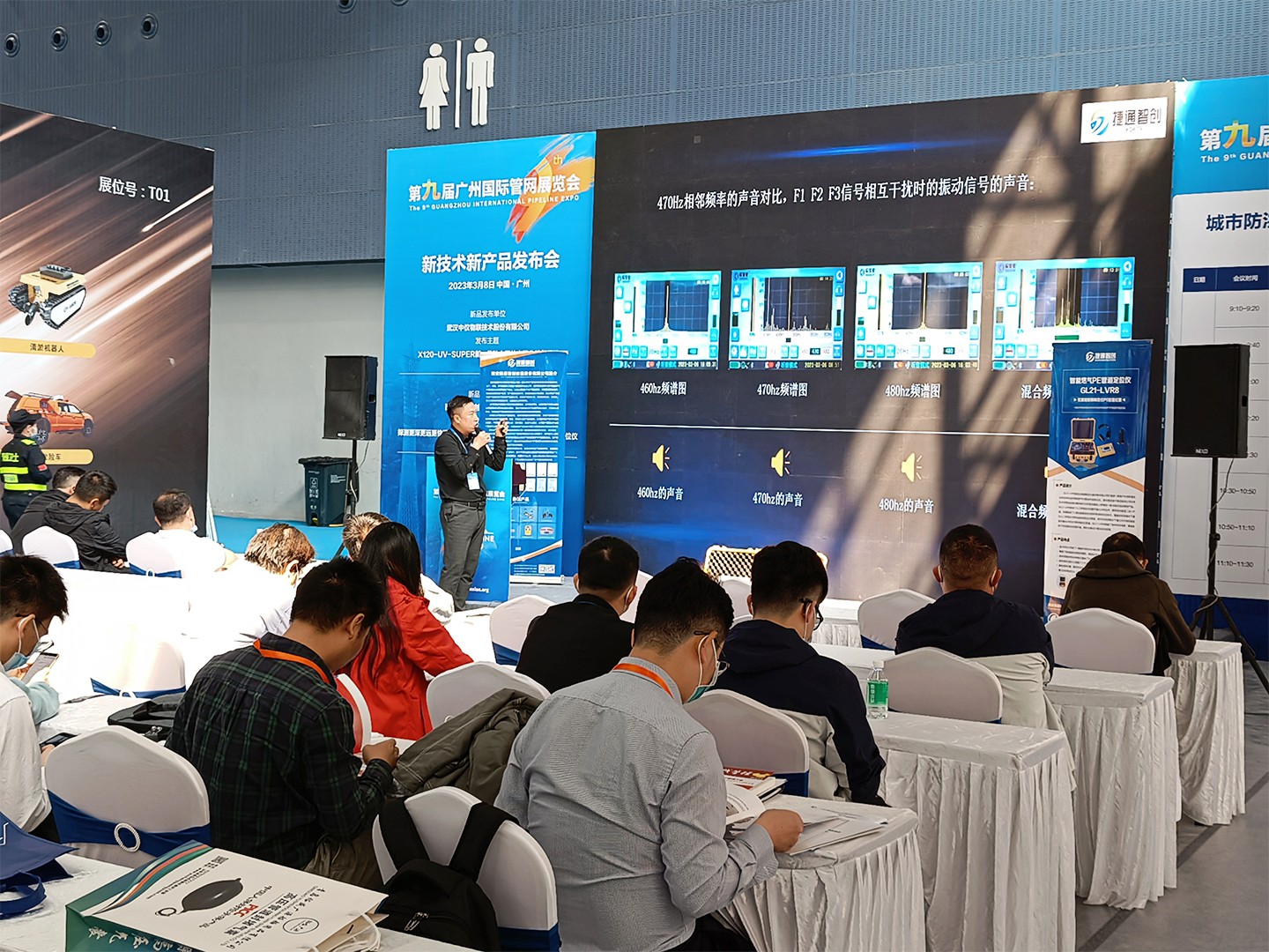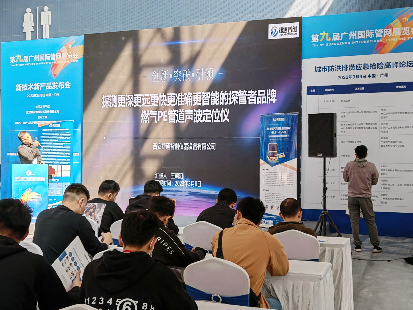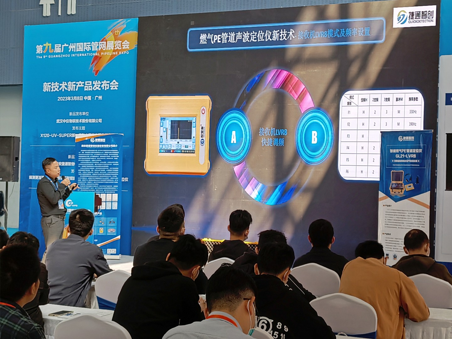 在本次展览会中,西安捷通智创公司首先进行了新品发布会,由总经理王朝阳先生重点展示基于听音和量化分析技术的全新升级的兼具测深功能的新产品智能燃气PE管道声波定位仪GL系列产品,该仪器是基于西安捷通智创公司在多年声学管线探测仪器研制行业积累的基础上研制的一款功能强大的重磅产品。它综合了人工听音技术和数字量化分析技术,即听音和数显二合一产品,仪器集成了之前的数显接收机和听音接收机的技术,既能在听音模式下通过人工听音技术更快捷更容易定位管道,也可在探测模式下通过非听音的振动信号量化分析技术更准确定位管道。仪器具有测深功能,兼顾了效率和准确度,更能适合于目前复杂的探测环境,同时仪器设计更加耐用坚固。新品发布会现场及产品展位前一直都是人流攒动,前来观看及咨询人员络绎不绝,广大经销商、代理商及行业专业人士对于西安捷通智创公司所推出的新产品均表现出了极大的兴趣和热忱。