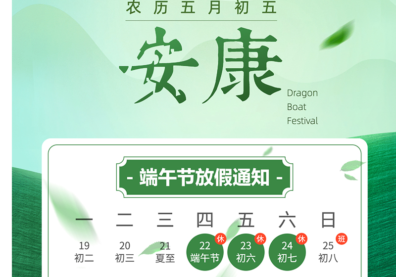 尊敬的广大新老客户朋友们: 大家好!艾叶又飘香,时间近端阳。 在这绿意盎然的盛夏时节,我们即将迎来了中国重要的传统节日——端午节。感谢大家长久以来对西安捷通智创公司的支持和信任,根据《国务院办公厅